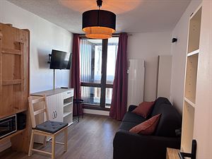 This apartment of about 38 m2, 7th floor, gets a big balcony on the south face with a marvellous view on the mountains and the village, 1 private bedroom with a double bed, 1 cabin with bunk beds, 1 c...